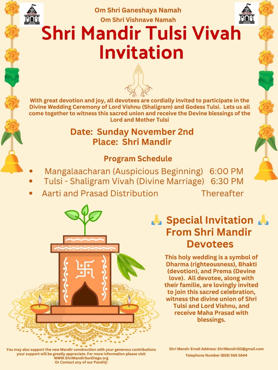 Tulsi Vivah Nov 2 - Mangalsacharan 6 pm, Tulsi Shaligram Vivah - 6:30 pm, Aarti and Prasad Distribution - Therafter